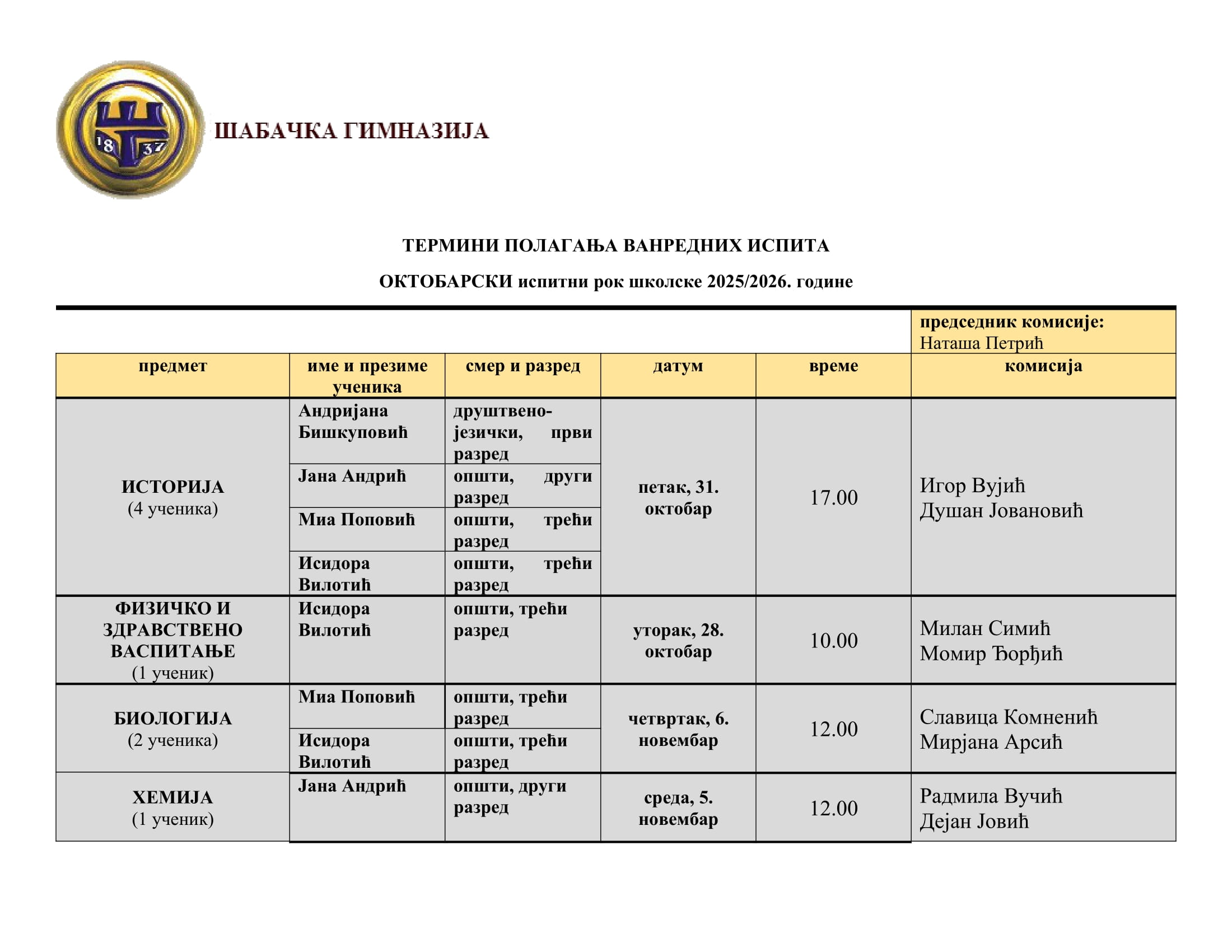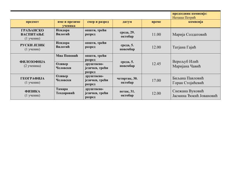 Обавештење за ванредне ученике – термини полагања ванредних испита за октобарски рок