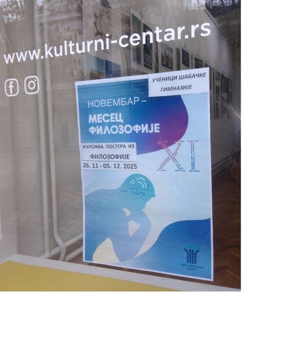 ГАЛЕРИЈА  КУЛТУРНОГ  ЦЕНТРА  У  ШАПЦ 26. 11. 2025.  –  05. 12. 2025. У  оквиру националне манифестације НОВЕМБАР – МЕСЕЦ ФИЛОЗОФИЈЕ коју је покренуло Српско филозофско друштво а подржала Школска управа Ваљево, у галерији Културног центра у Шапцу, у среду, 26. 11. 2025. године,  са почетком у 12.00 часова отворена  је изложба постера посвећених филозофији. Избор ...