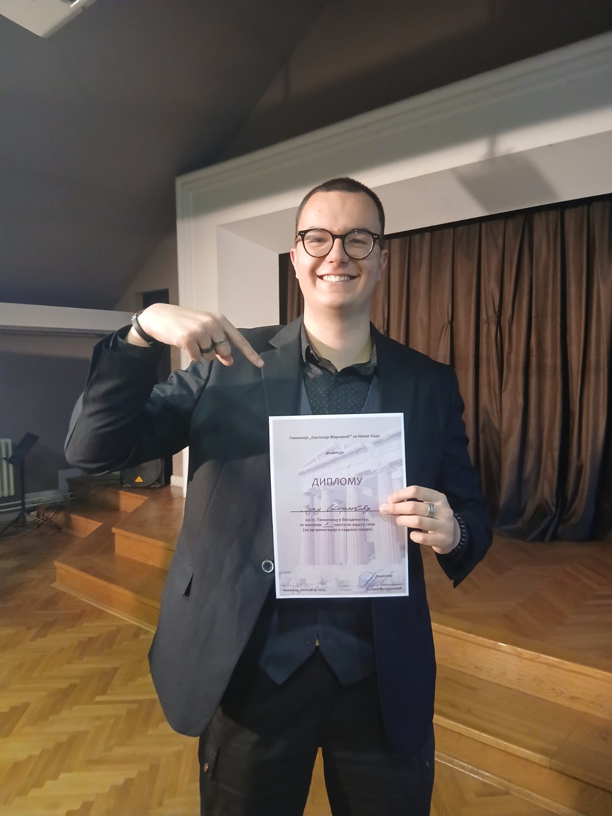 Овогодишња задата тема гласила је: Човек је трска која мисли. Ова знаменита мисао Блеза Паскала отвара низ егзистенцијалних и етичких питања која је ученик самостално протумачио у дозвољеном времену од пет минута. Вук Стојановић је наступио самоуверено, изговоривши уверљиво беседу која се издвојила и аргументованим садржајем и естетско-стилским изразом. Стручни жири, који чине еминентни професори Филозофског факултета у Новом Саду, наградио је Вукову беседу 1.местом за аргументацију и садржај говора. Наш ученик је поред представника специјализованих филолошких гимназија из Београда и Сремских Карловаца успео да освоји 1. награду! Победа на овом такмичењу, из предмета који Вук нема на свом смеру, потврђује његову даровитост, образованост и свестраност.